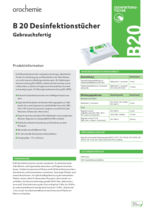B 20 Desinfektionstücher sind gebrauchsfertige, alkoholfreie Tücher für die Reinigung und Desinfektion der Oberflächen von nicht invasiven Medizinprodukten gem. EU-Medizinprodukteverordnung (EU-MDR), medizinischem Inventar sowie in Bereichen, in denen ein hygienisch einwandfreier Zustand notwendig ist gem. EU-Biozidprodukteverordnung (EU-BPR).