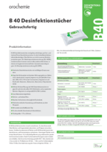 - B 40 Desinfektionstücher sind gebrauchsfertige, parfüm- und farbstofffreie Desinfektionstücher für die Schnelldesinfektion alkoholbeständiger Oberflächen von nicht invasiven Medizinprodukten gem. EU-Medizinprodukteverordnung (EU MDR), medizinischem Inventar sowie in allen anderen Bereichen, in denen ein hygienisch einwandfreier Zustand notwendig ist gem. EU-Biozidprodukteverordnung (EU-BPR).